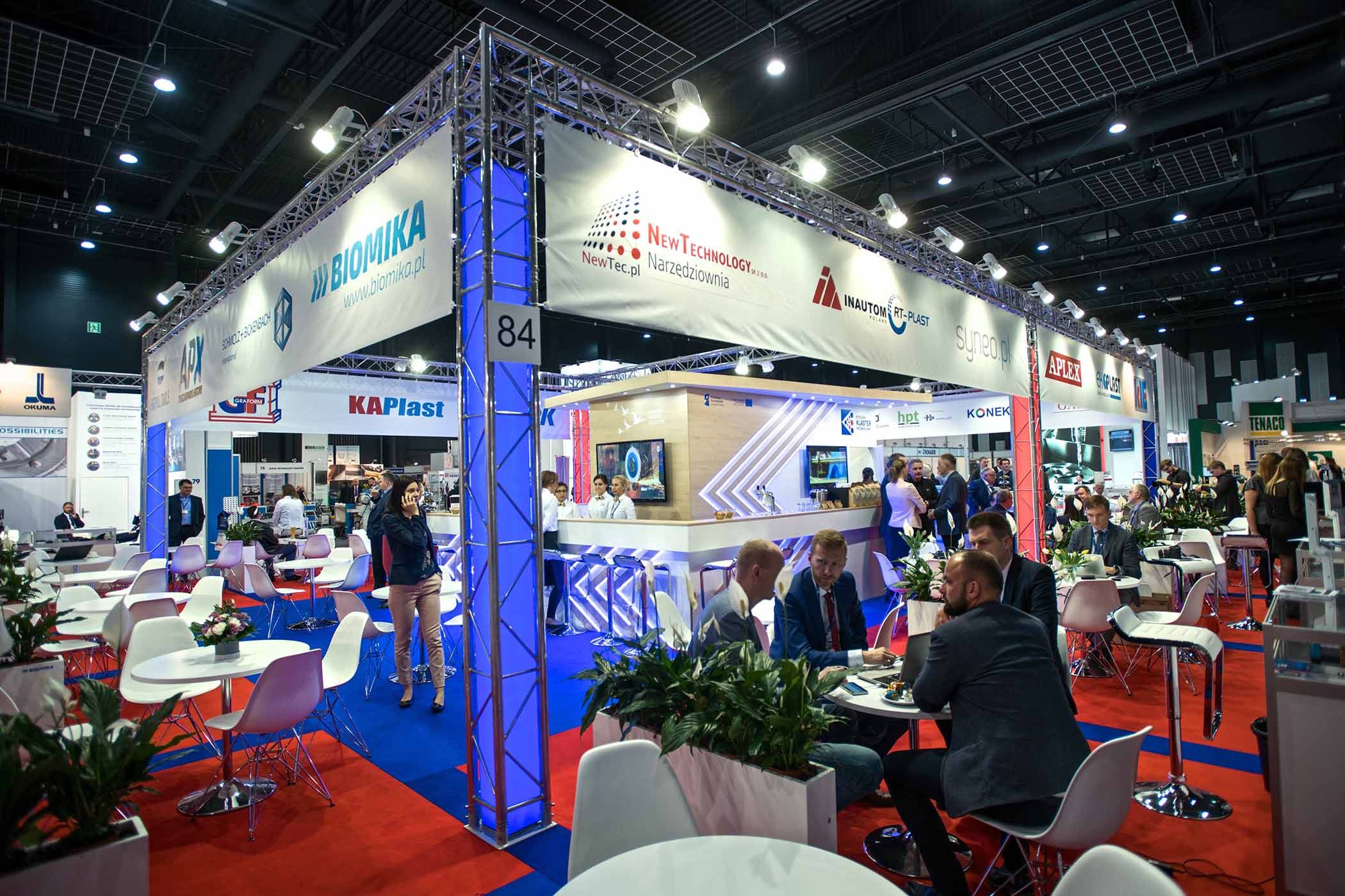 Zdjęcie hali targowej z licznymi stoiskami, mało widoczne w oddali logotypy firm