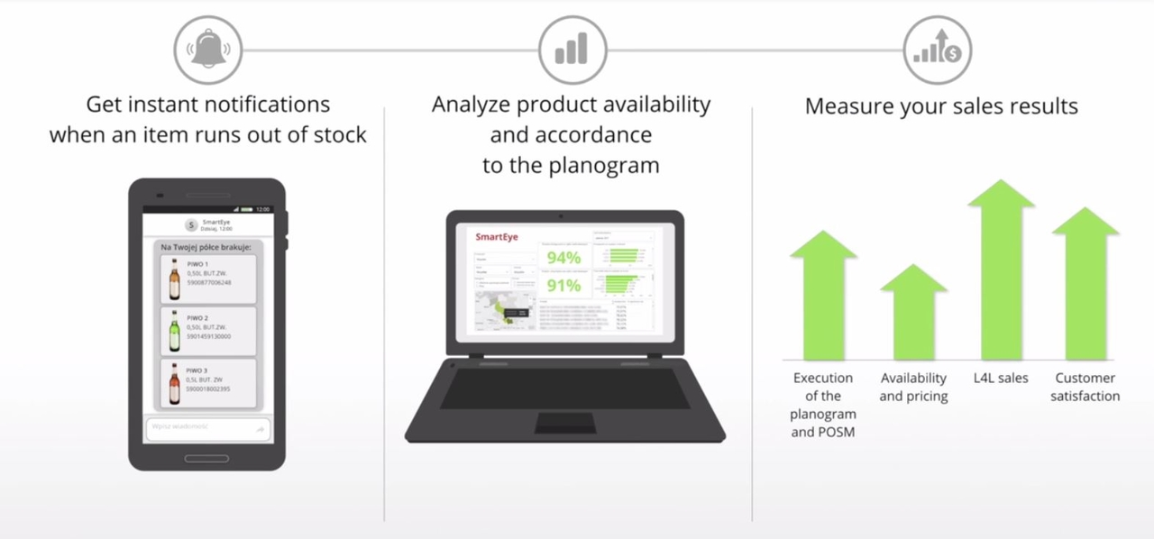 SmartEye pełni funkcję nowoczesnego audytora handlowego. Jednak działa sprawniej i szybciej, a to przekłada się na realne korzyści dla właścicieli. Na terenie sklepu rozmieszczona jest sieć kamer, które regularnie wykonują zdjęcia półek sklepowych. Następnie są one analizowane, a jeśli stan zatowarowania nie zgadza się z założeniami zostaje wysłany komunikat do administratora.