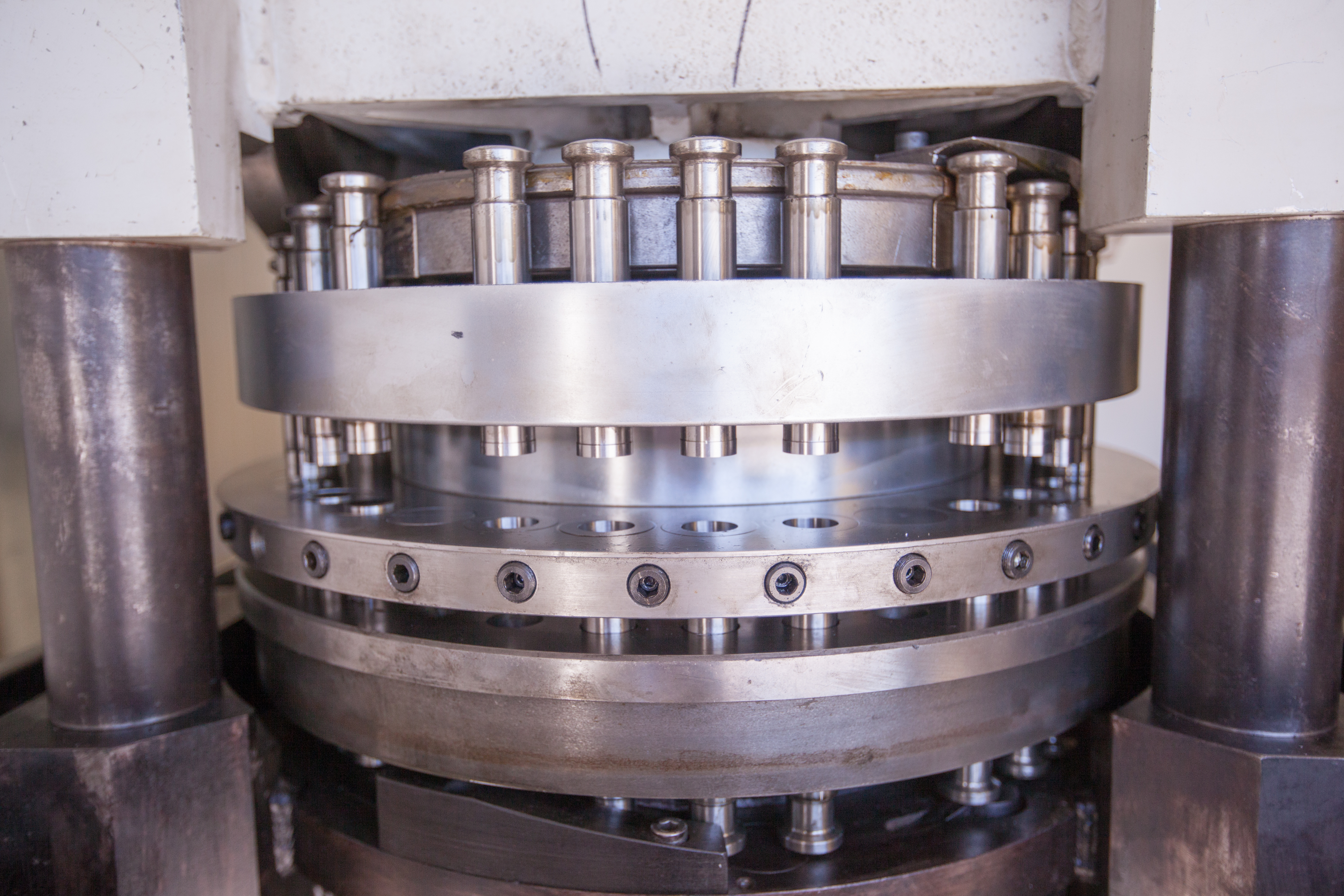 Zbliżenie na fragment tabletarki rotacyjnej