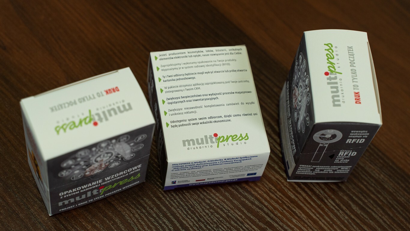 Firma MULTIPRESS G.Wodecki, D.Wodecka B.Wodecki Sp.J. to drukarnia, która początkowo swoją przygodę z poligrafią rozpoczęła od własnego studia graficznego. Obecnie oferta firmy umożliwia druk wydawnictw, opakowań oraz reklamę wizualną. Przedmiotem projektu z pozyskanym środków z funduszy europejskich było podniesienie poziomu konkurencyjności firmy poprzez wdrożenie wyników prac B+R oraz uruchomienie na ich podstawie przemysłowej produkcji innowacyjnych opakowań z układem umożliwiającym wykrycie otwarcia lub próby otwarcia. Realizacja projektu objęła wdrożenie wyników prac B+R dotyczących nowego produktu wytwarzanego w nowej technologii. Unikalny charakter rozwiązania polega na elektronicznej kontroli zamknięcia opakowania. Specjalny nadruk wykonany w technice sitodrukowej UV farbą elektroprzewodzącą na elementach zamknięcia umieszczony jest na zamknięciu opakowania oraz na fragmentach perforowanych. Miniaturowy czujnik RFID (czujnik bezpieczeństwa) umieszczony jest wewnątrz opakowania i rejestruje jego otwarcie. Weryfikacja stanu opakowania jest sprawdzana za pomocą dekodera-telefonu który posiada specjalne oprogramowanie, które wskazuje na otwarcie opakowania.