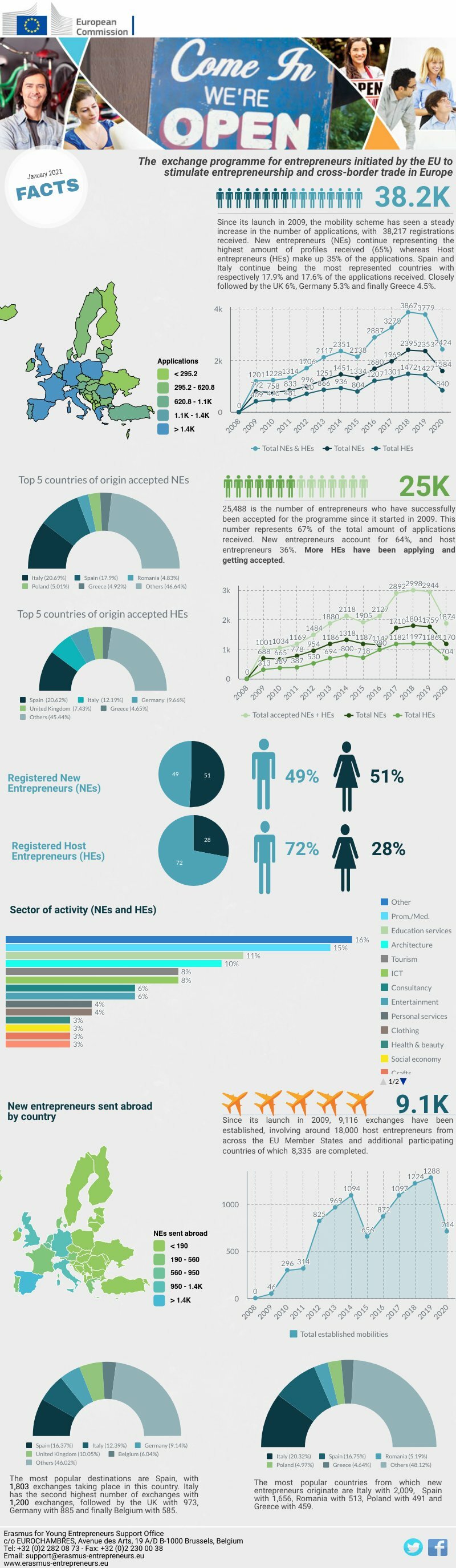 Jeśli chodzi o liczbę uczestników, jak i przyjętych wniosków składanych przez młodych przedsiębiorców – Polska zajmuje odpowiednio szóste (za Hiszpanią, Włochami, Wielką Brytania, Niemcami i Grecją) oraz czwarte miejsce (za Włochami, Hiszpanią i Rumunią) z 491 zgłoszeń od NEs.