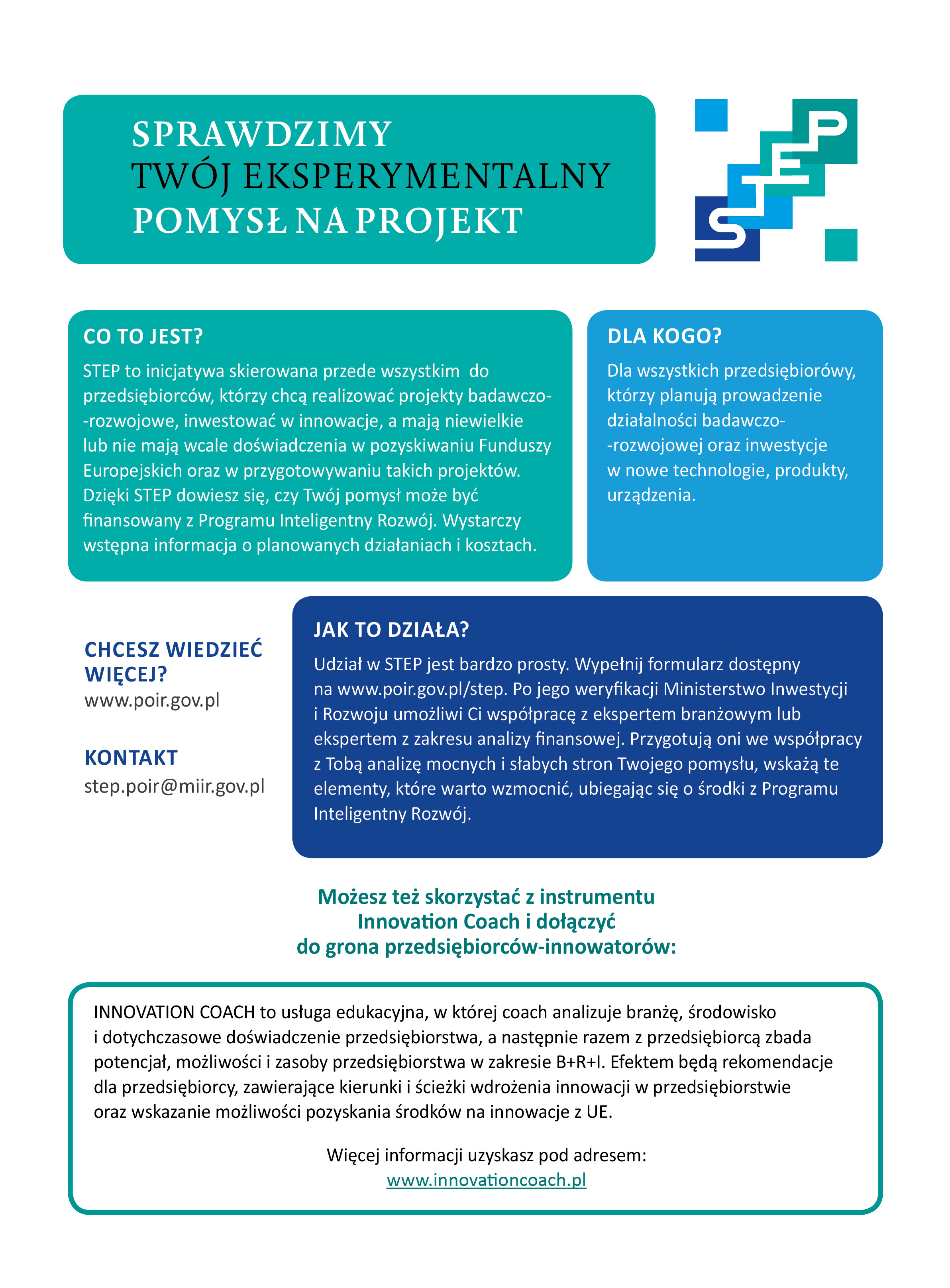 Ministerstwo Funduszy i Polityki Regionalnej we współpracy z instytucjami wdrażającymi działania konkursowe w ramach Programu Inteligentny Rozwój, siecią Punktów Informacyjnych Funduszy Europejskich, Krajowego Punktu Kontaktowego Programów Badawczych Unii Europejskiej oraz ekspertami posiadających doświadczenie w ocenie wniosków konkursowych, zapraszają przedsiębiorców do korzystania z instrumentu STEP.